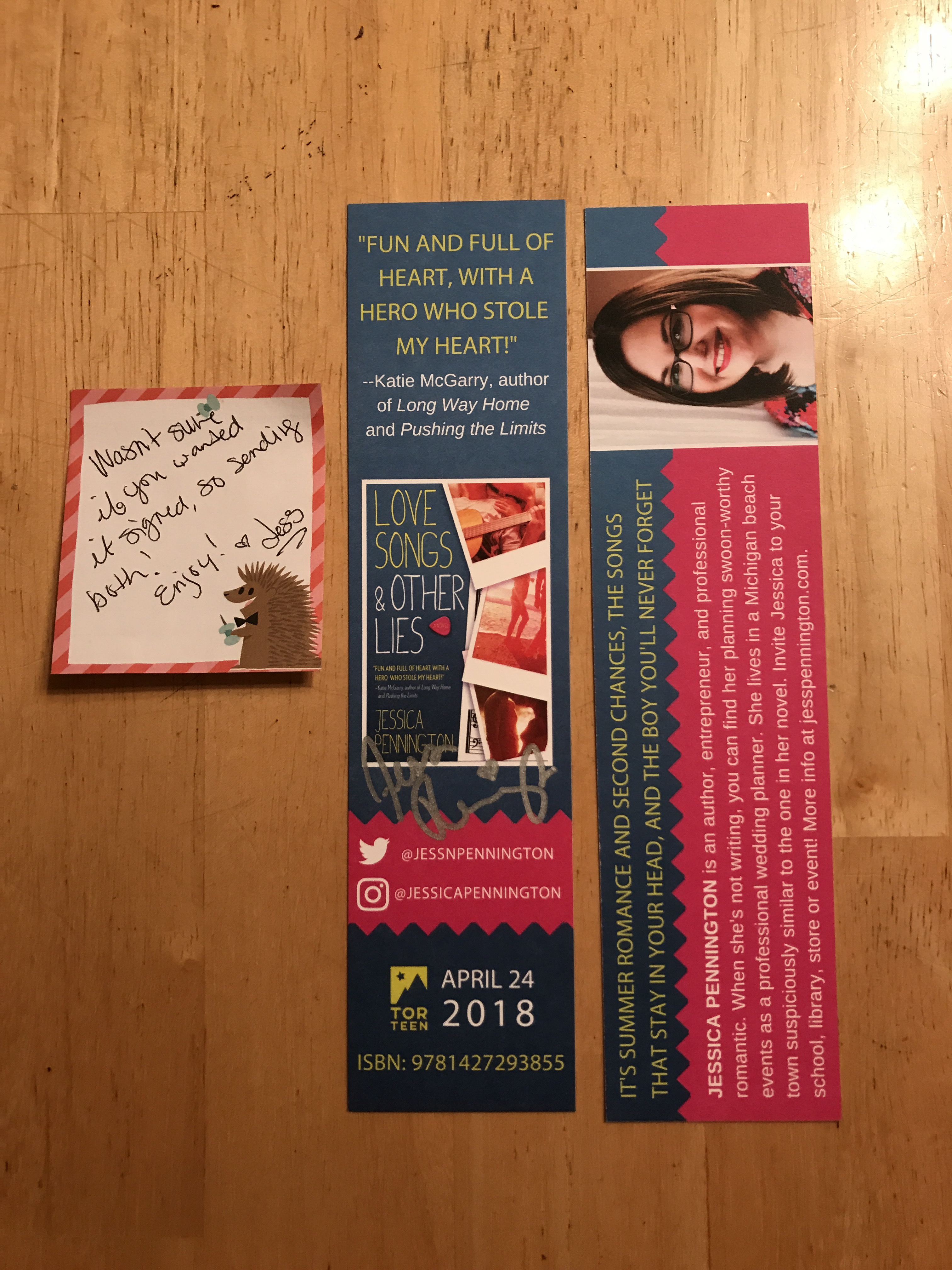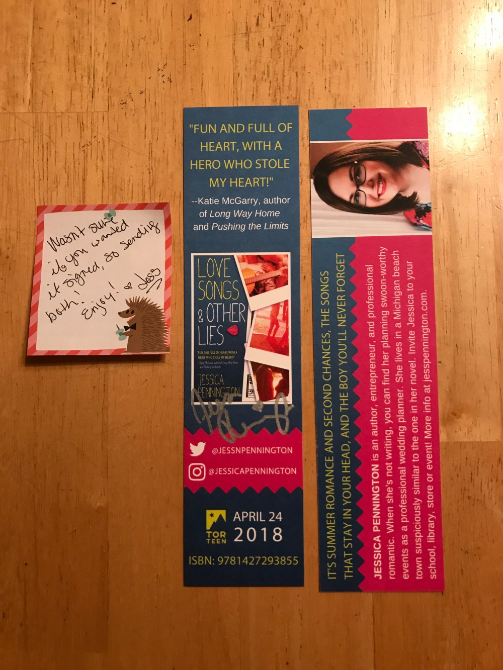 So for those of you who don’t know, Jessica Pennington’s debut novel ‘Love Songs & Other Lies’ will debut in April 2018!! (Read my ARC review of it here!) She recently designed her own bookmarks, and was kind enough to send them to me! She’s honestly the sweetest–she sent me a signed one and an unsigned one!